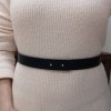 Originální zapínání na dva sedlářské knoflíky odstraní nevzhlednou bouli od klasické spony pod přiléhavým tričkem. Díky chytrému umístění zapínání na konci pásku jeho konec nikdy neodstává a opasek si zachovává perfektní tvar po celý den. Šířka 3 cm je ideální k sukni, kalhotám i šatům, a černá barva se hodí doslova ke každému outfitu.